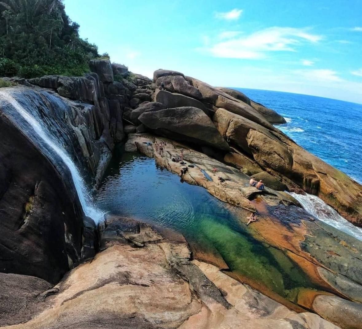 - Piscina infinita natural: a cachoeira se encontra com o mar criando uma borda infinita visual que encanta.